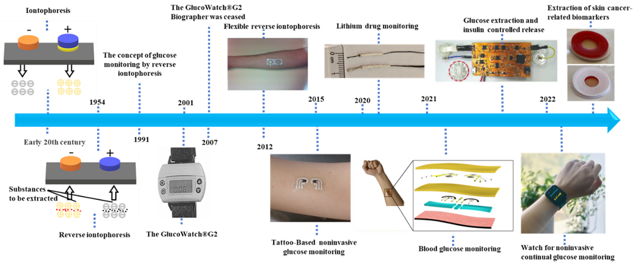 以皮肤为中心的诊断技术,如表皮生理参数监测,近年来发展迅速。 皮下细胞间液(ISF)是一种具有丰富生理信息的体液,分析皮下ISF是获得人体健康状况的一种很有潜力的方法,皮下ISF可通过植入或经皮测量进行评估。 反向离子电渗技术通过在皮肤上施加电场来提取 ISF,这是一种很有前途的无创获取 ISF 的方法,配合传感器可实现无创表皮生理参数监测。 然而,由于器件的刚性和低生物相容性,反向离子电渗技术在2010年代前后发展相对缓慢。近年来随着柔性电子技术的快速发展,给反离子电渗技术的应用带来的新的契机,尤其是在血糖监测和药物监测领域取得了新的进展。