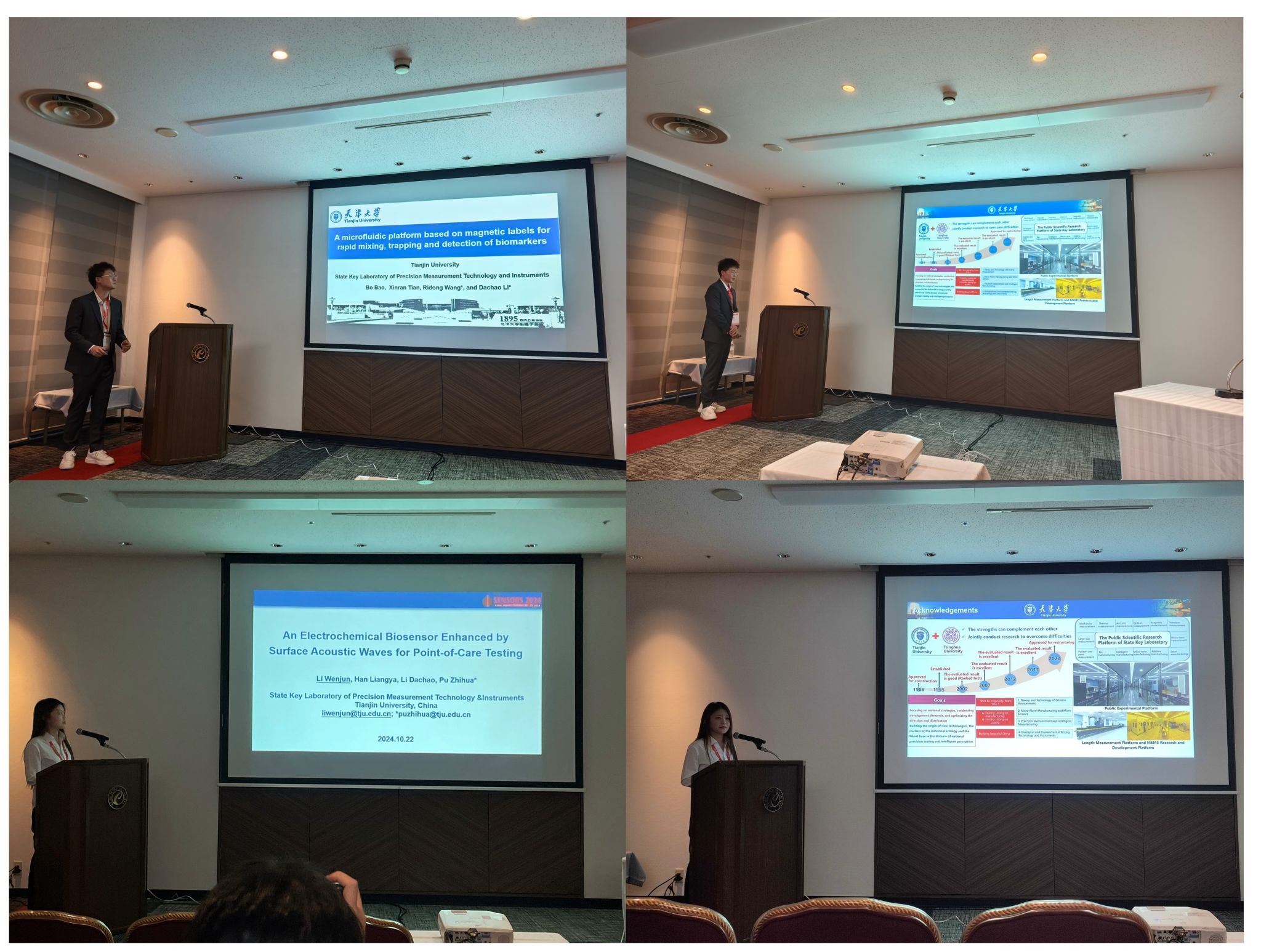 课题组王日东和蒲治华老师带领两名博士生一同赴日参加该会议。蒲治华老师担任了“Chemical Sensing and Biosensing”分会场主席。博士生鲍博就题为《A Microfluidic Platform Based on Magnetic Labels for Rapid Mixing, Trapping and Detection of Biomarkers》的论文工作进行口头汇报展示,展示了我们课题组在生物弱磁传感与微流控芯片技术融合方面的最新研究进展。博士生李文君则就《An Electrochemical Biosensor Enhanced by Surface Acoustic Waves for Point-of-Care Testing》的论文工作进行口头汇报展示,介绍了课题组在高频表面声波技术与生物微流控芯片技术融合方面的研究工作进展。两位博士生在报告结束后与多位学者进行了深入的交流和讨论,他们的汇报得到了分会场主席的认可与高度赞扬。