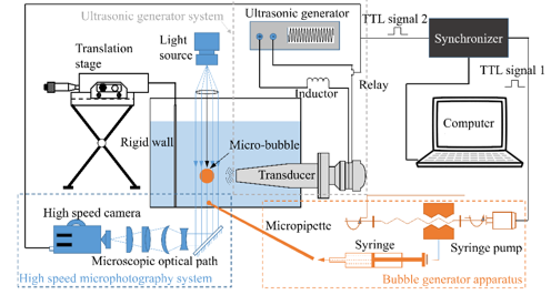 超声广泛应用于透皮给药、超声溶栓、靶向基因治疗以及靶向给药等。但是,由于对声空化效应直观观测研究的匮乏,导致了超声空化关键作用机制的缺失。作为空化效应的直观反映,超声场中微气泡的动力学过程成为研究超声空化作用机制的重要参考。课题组通过研究近壁面微气泡在超声场中的动力学过程,获得了气泡崩溃的动力学过程以及压力场等关键信息。