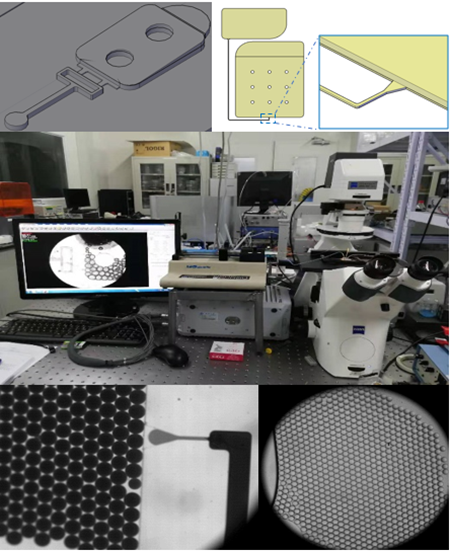 研究意义:阶梯乳化液滴微流控技术可实现单分散液滴的高通量生成,应用于液滴数字PCR技术中完成核酸分子的绝对定量,在疾病诊断、基因组学、病毒筛查等领域具有重要的应用前景。课题组基于微流控与光电检测技术,分别设计加工基于压力驱动与离心驱动的阶梯乳化微流控芯片,生成单分散乳化液滴,用于包裹核酸分子与PCR反应体系试剂,进而在微量液滴内完成PCR反应,并设计光电图像处理算法实现液滴明场图像与荧光图像的检测,得到核酸分子的初始浓度